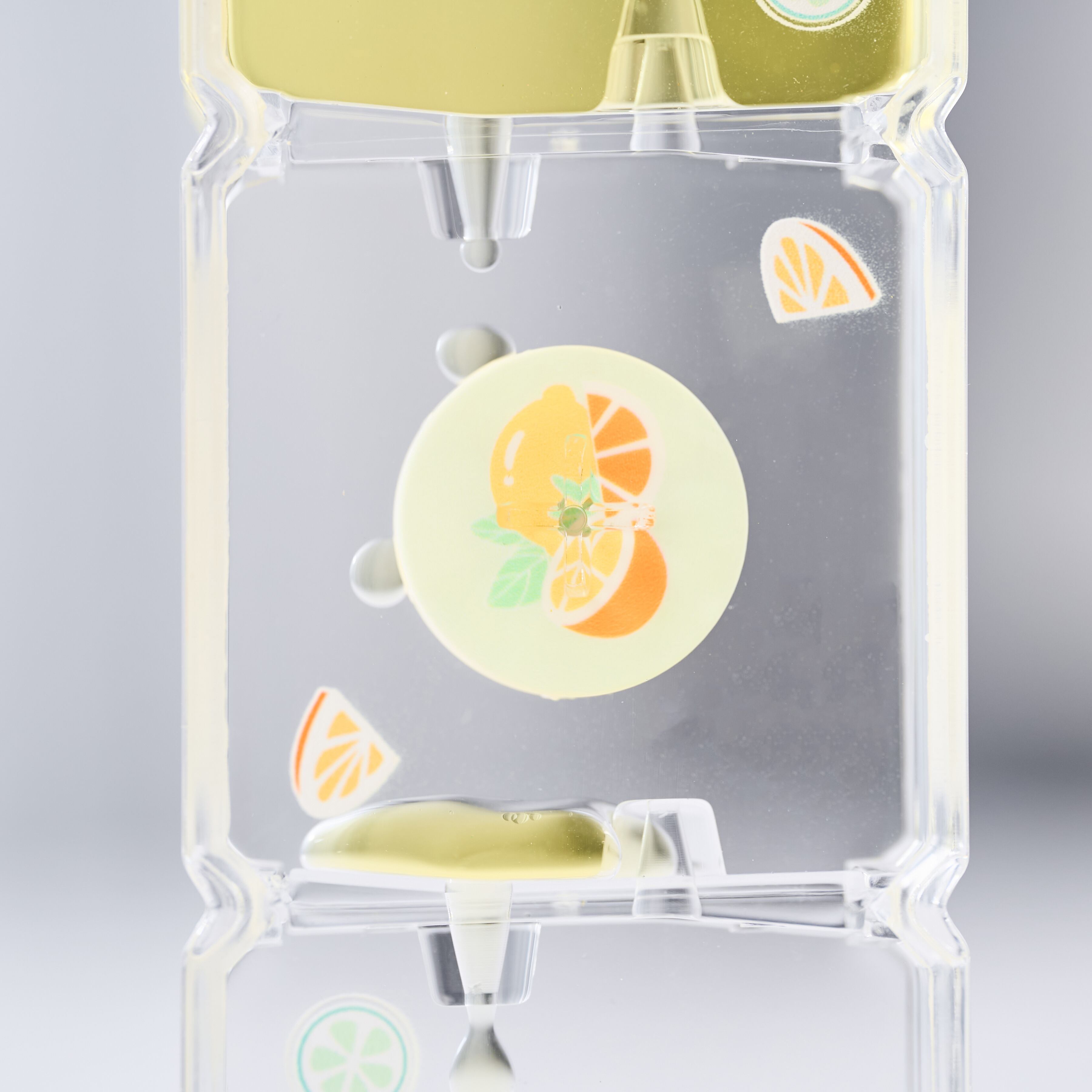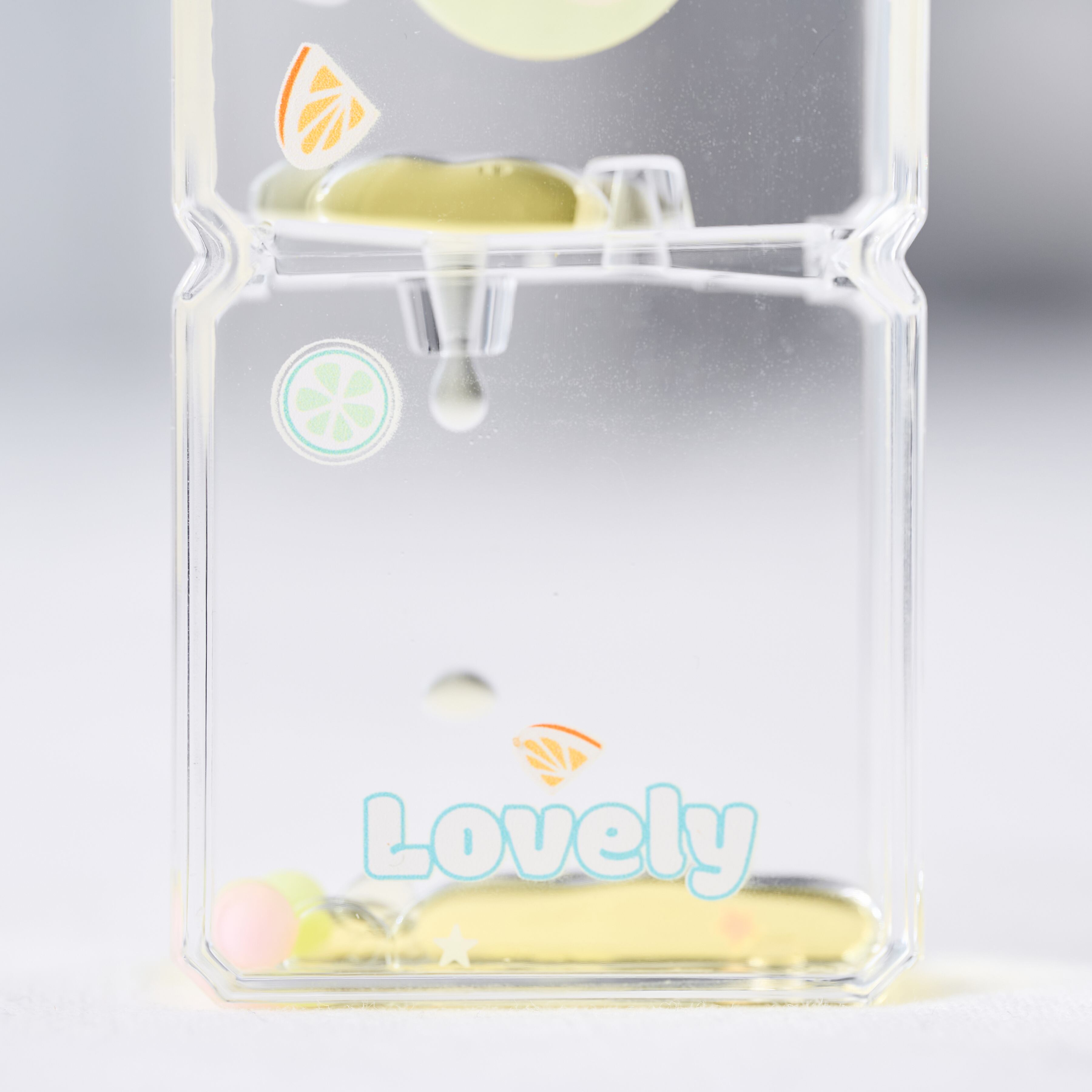 水車部分にはフルーツのイラストがあしらわれ、外側にもフルーツやポジティブな英語メッセージが。