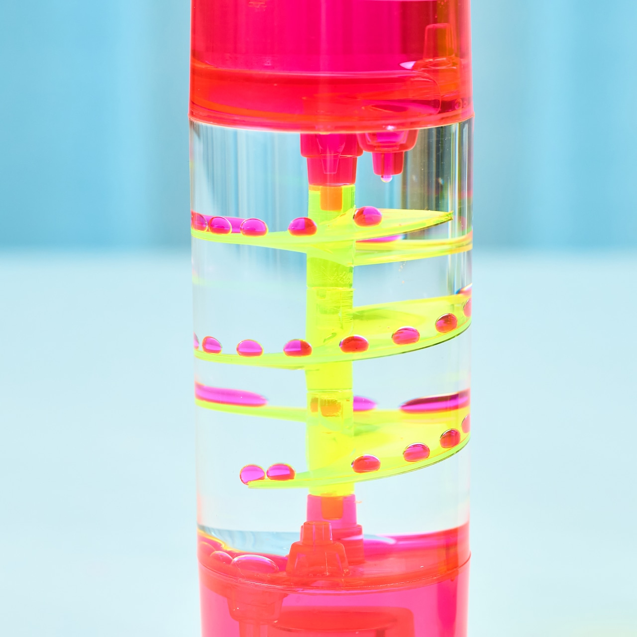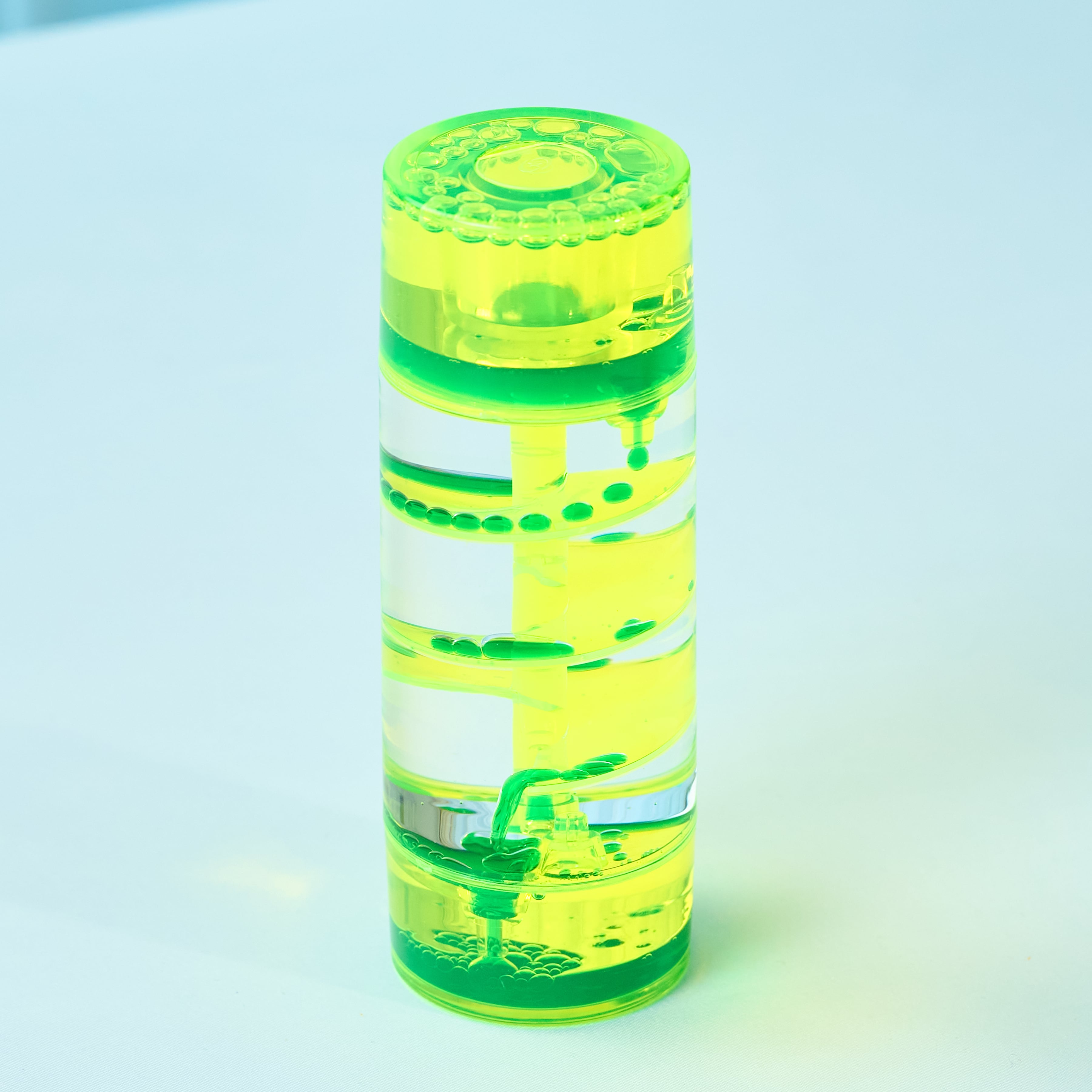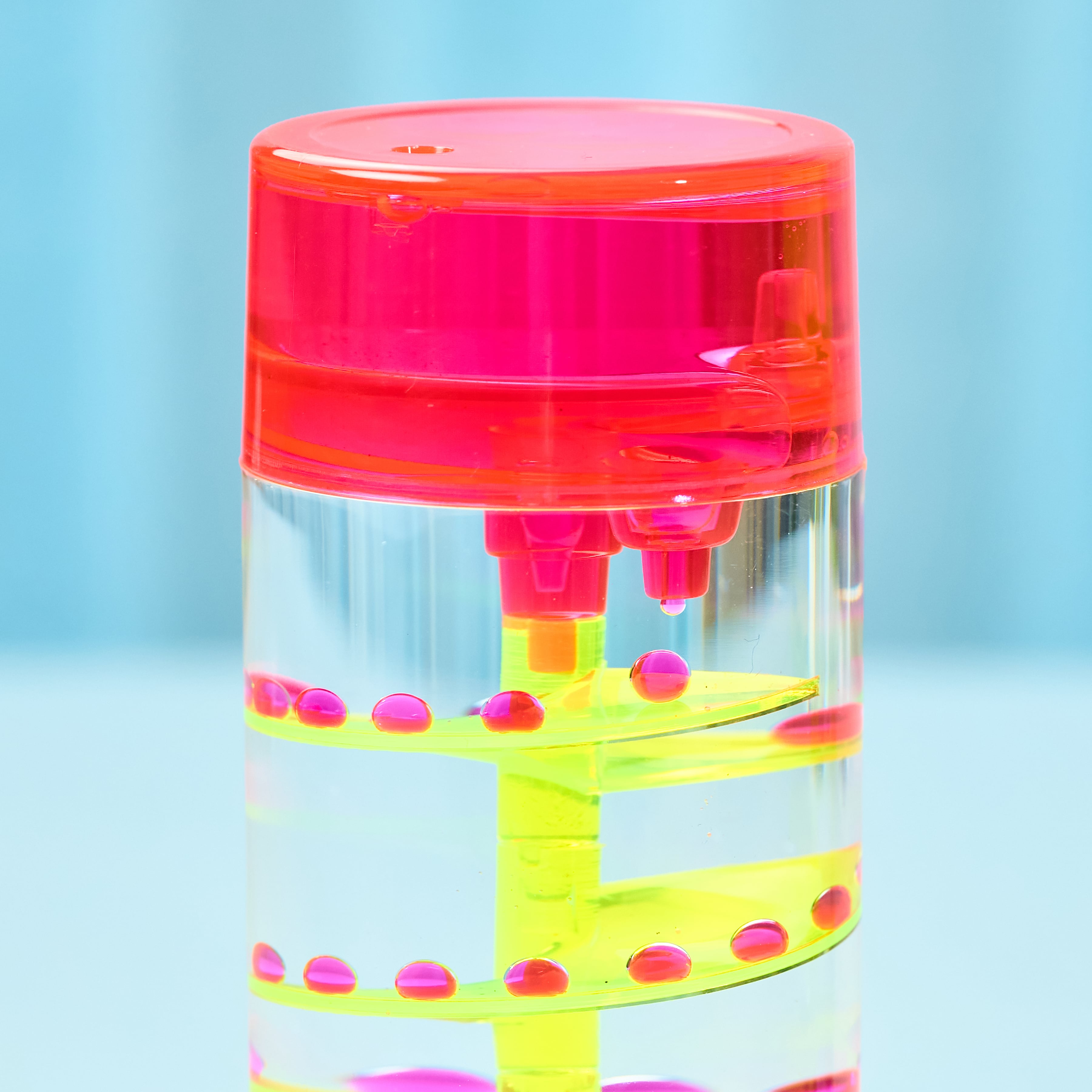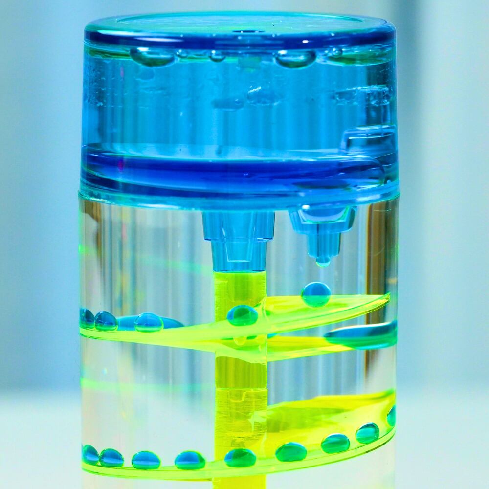 シンプルな円柱の中で、ネオンカラーのしずくが
