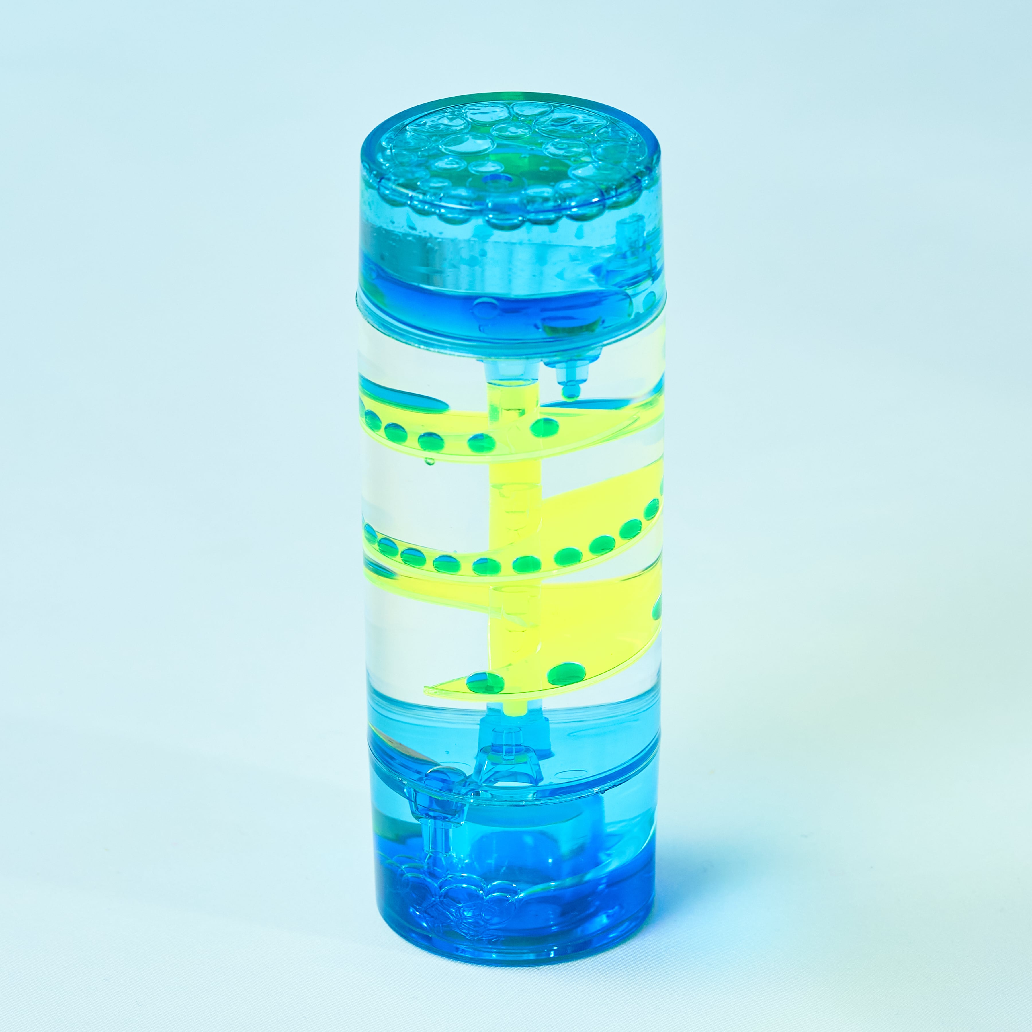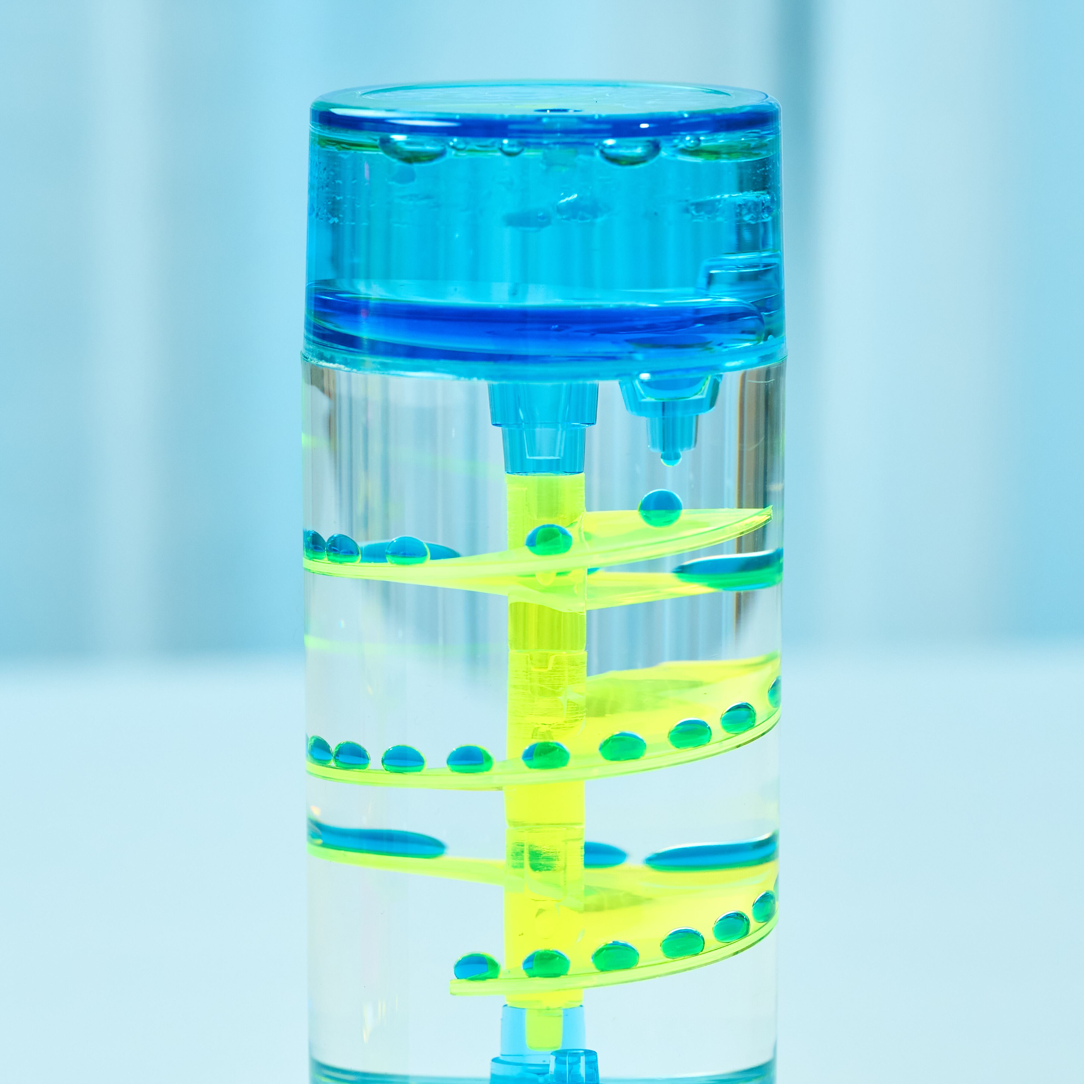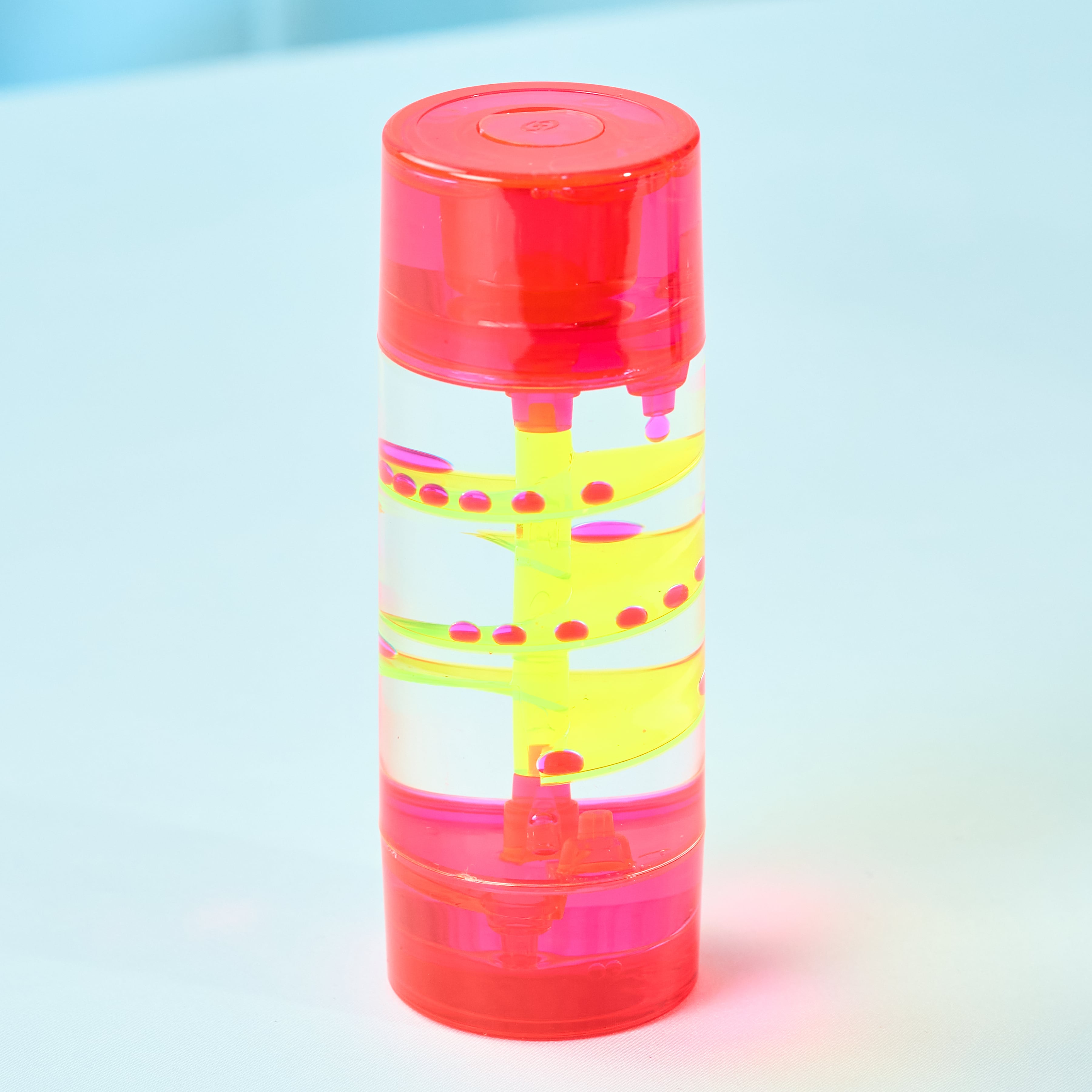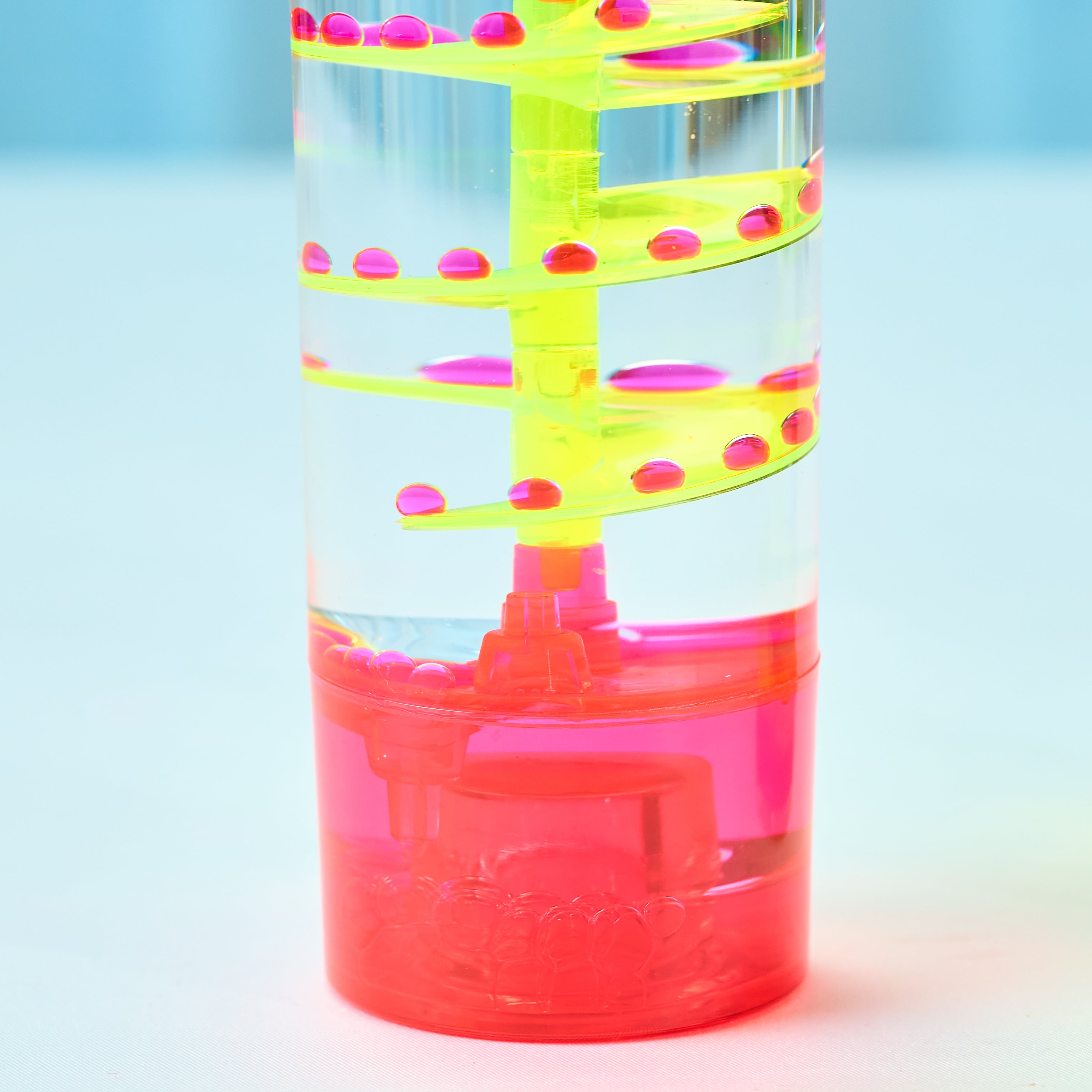 シンプルな円柱の中で、ネオンカラーのしずくが